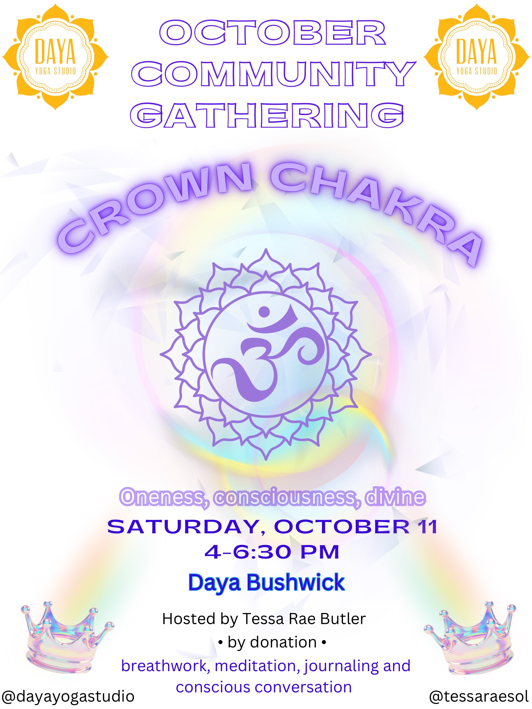 You’re invited to our October Community Gathering at Daya in Bushwick on Saturday, October 11th at 4 pm. The final month of our chakra series, this month we dive into the crown, or Sahasrara, chakra. Our energy center that connects us with divine wisdom and universal consciousness. Activating and opening this energy center help to bring spiritual clarity and a sense of unity with all beings. This gathering is a space to connect with your community, and spend time in relationship with Spirit together. Taking time to engage with unity consciousness, and discuss practical ways that we can bring deeper joy, understanding, and connection into our daily lives. Together we’ll practice some kundalini yoga, meditation and journaling + sharing to inspire conscious conversation. Bring an open mind & heart, a journal if you have one, and wear something comfy (bonus points for wearing white or rainbow!). As always, this gathering is free/by donation. Looking forward to seeing you there, divine beings!