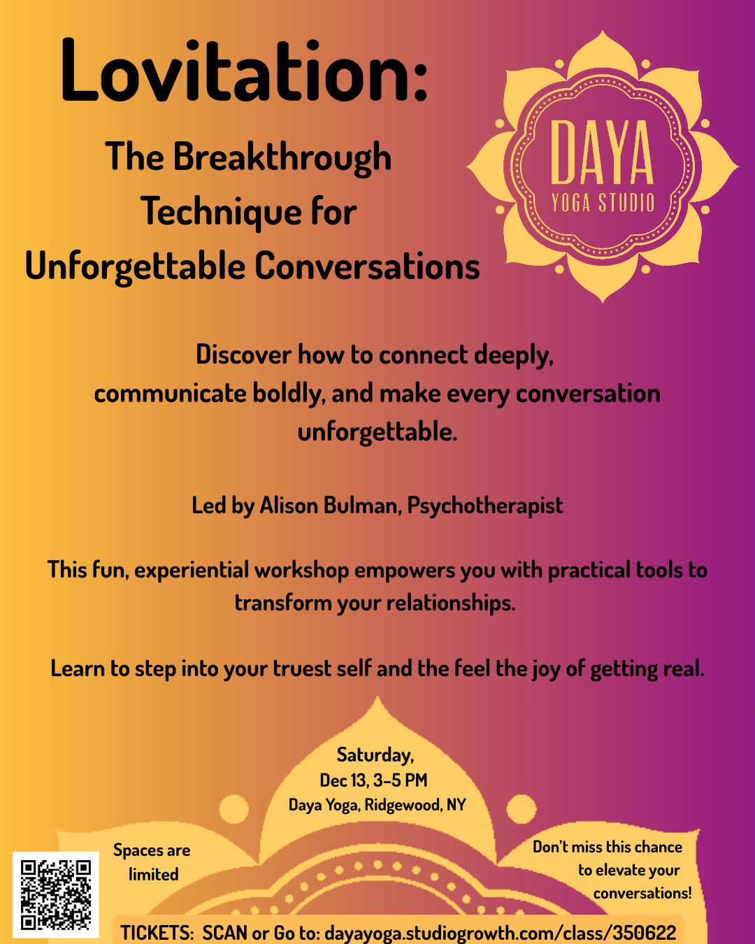 Through music-guided meditation, one-on-one exercises, and unique group interactions, Alison Bulman, LCSW, gently teaches how to lower defenses and embrace authenticity. These tools don’t just stay in the workshop—they enliven relationships, interactions, and even your dates.