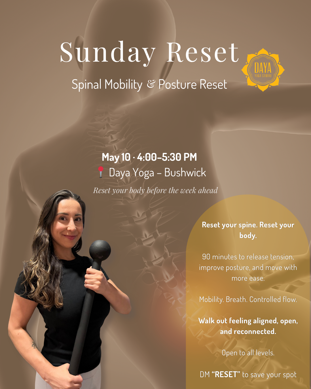 A 90-minute spinal mobility workshop to release tension, improve posture, and reset your body for the week ahead.